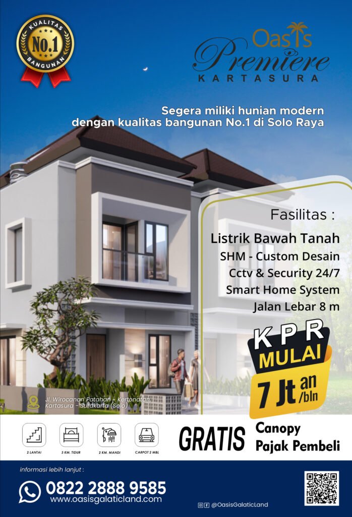 Di bawah naungan Oasis Galatic Land, developer properti No.1 di Solo Raya, Oasis Premiere Kartasura hadir sebagai perumahan premium yang memadukan lokasi strategis, desain modern, dan kualitas terbaik. Terletak di jantung Kartasura—gerbang utama menuju Solo, Yogyakarta, dan Semarang—perumahan ini memberikan nilai lebih bagi investasi maupun tempat tinggal.